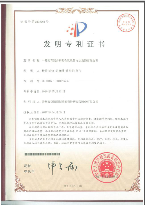日前,我公司工程試驗(yàn)中心工程應(yīng)用技術(shù)創(chuàng)新團(tuán)隊(duì)申報(bào)的“一種瀝青混合料配合比設(shè)計(jì)方法及瀝青混合料”獲得了國家知識(shí)產(chǎn)權(quán)局頒發(fā)的發(fā)明專利證書,專利號(hào):ZL 2016 1 0310795.5。