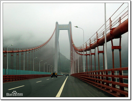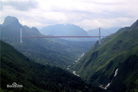 ??大橋于2005年4月18日正式開工建設, 2009年12月23日建成通車,標志五縱七橫國道主干線滬瑞高速公路全線貫通。大橋主橋為跨徑1088m的單跨鋼桁架懸索橋, 其跨度在同類型橋梁中位居“國內(nèi)第一、世界第六”。橋面總寬28m,車行道寬11m,為雙向4車道,大橋全長2237m,距河面垂直高度370m。全橋使用各類鋼材約6.5萬噸、螺栓組80萬個,澆筑混凝土約25萬m3。引橋采用50米預應力混凝土連續(xù)剛構,東岸引橋長940.4m,西岸引橋長200m。大橋的建成通車,使得從黃果樹風景區(qū)到關嶺縣城的里程縮短20公里,車程從半小時縮短到5分鐘,從興義到貴陽車程可縮短到4小時以內(nèi)。對促進黃果樹風景區(qū)成為貴州旅游龍頭有著重要的意義。