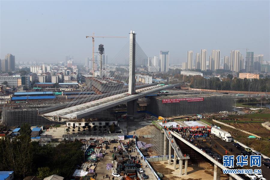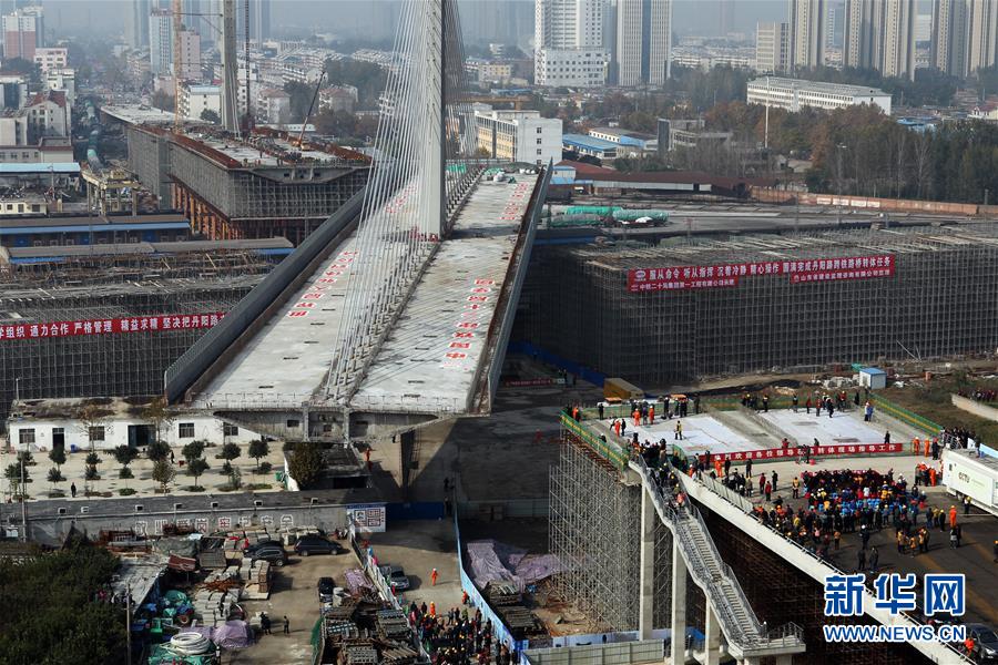 2016年11月08日,山東省菏澤市,菏澤丹陽立交橋主橋轉(zhuǎn)體工程正式實(shí)施。丹陽立交橋需要轉(zhuǎn)體的斜拉轉(zhuǎn)體主橋跨京九鐵路,長238米,重2.48萬噸,逆時(shí)針完成81.67度轉(zhuǎn)體,建成后將成為世界上最重的斜拉轉(zhuǎn)體橋。11時(shí)30分,當(dāng)日,在兩臺(tái)350噸連續(xù)式千斤頂?shù)臓恳?,自重達(dá)2.48萬噸的山東菏澤丹陽路立交橋東側(cè)主橋逆時(shí)針轉(zhuǎn)動(dòng)81.67度,與引橋?qū)崿F(xiàn)精準(zhǔn)對(duì)接。至此,當(dāng)今世界轉(zhuǎn)體重量最大的斜拉橋成功“轉(zhuǎn)身”。丹陽路立交橋全長2031米,跨越京九、新兗鐵路及菏澤貨場(chǎng)。為了減少施工對(duì)既有鐵路線的干擾,確保鐵路運(yùn)行安全,施工部門采取“先建后轉(zhuǎn)”工藝,先沿鐵路平行方向建設(shè)橋體,再將建好橋體沿逆時(shí)針方向轉(zhuǎn)體至設(shè)計(jì)位置。